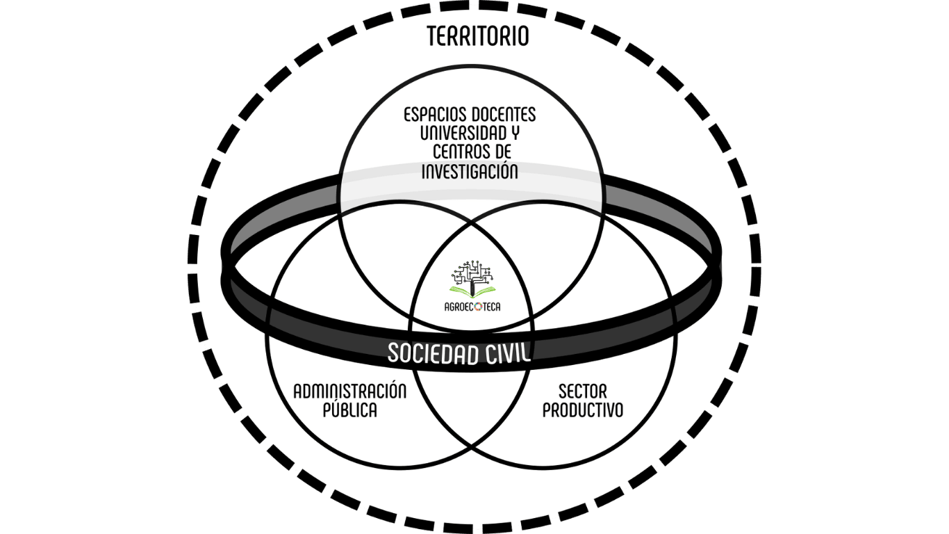 La Agroecoteca, en la práctica, funciona como un laboratorio virtual de innovación abierta en agroecología que apuesta por un modelo de Quíntuple Hélice, donde convergen productores, empresas y profesionales del sector con otros agentes de la universidad y los centros de conocimiento e investigación, de la administración pública, a cualquiera de sus escalas y de la sociedad civil (ciudadanía organizada y no-organizada), sumando y multiplicando competencias, saberes y palancas de cambio e incorpora también una quinta dimensión fundamental, como ya hemos explicado, cuando hablamos de prácticas agroecológicas, el territorio y sus particularidades, en este caso de Extremadura como bio-región que se expande de sus límites administrativos y se encaja en la lógica bio-regional de las cuencas medias de los ríos Tajo y Guadiana en la Península Ibérica.
