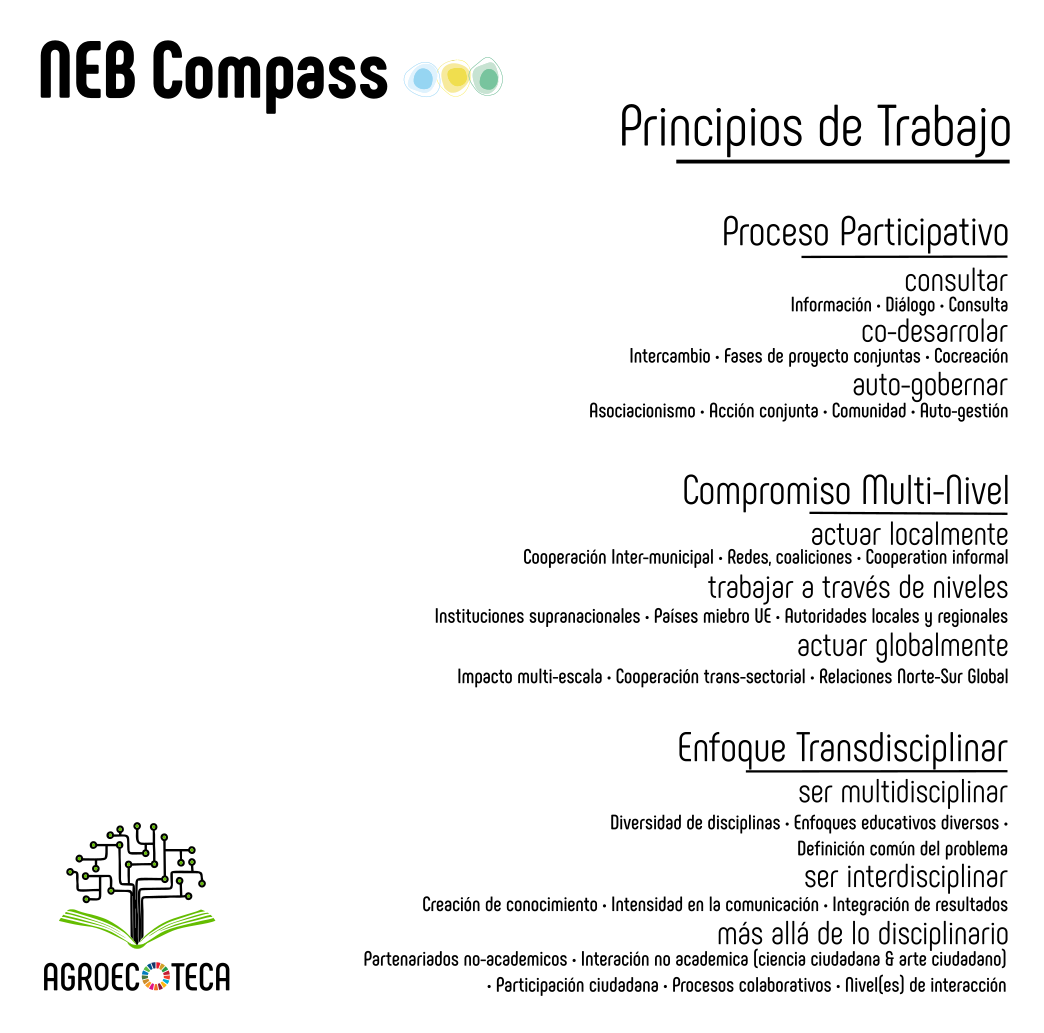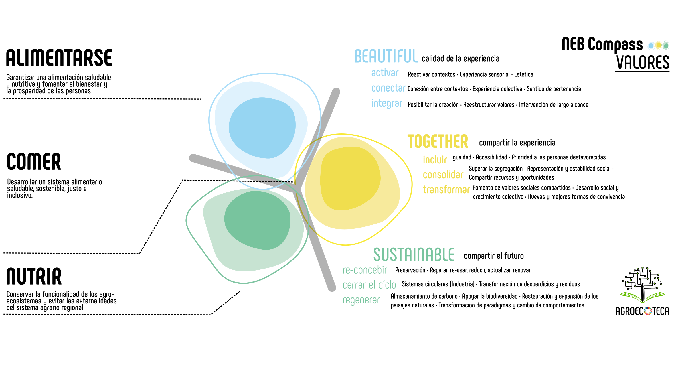 La Agroecoteca, asume igualmente como propios, además de los valores, los principios de trabajo lanzados por la Nueva Bauhaus Europea a través del documento de trabajo NEB Compass: