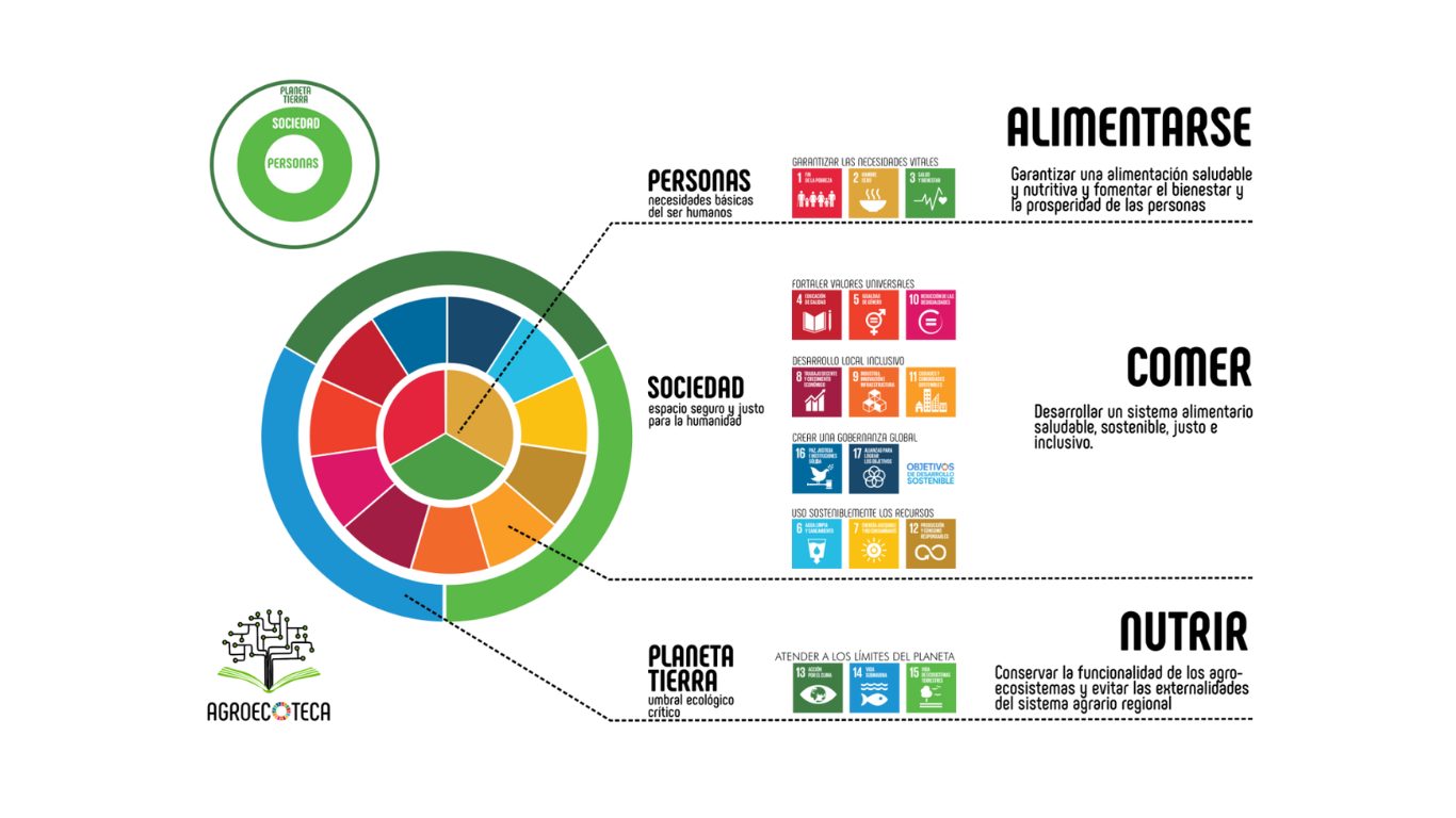 Como hemos comentado, el proyecto Agroecoteca, está basado en el poder transformador que pueden tener las prácticas agroecológicas, sobre un determinado territorio, por lo que utiliza un marco de acción de los ODS ajustado a este enfoque y estructurado a través de las tres esferas de la alimentación ya comentadas: